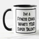 Divertido eslogan en una taza que dice "Soy entrenador de fitness. ¿Cuál es tu supertalento?". Dos tazas para entrenador de fitness. Texto en negrita en blanco y negro.