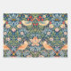 Patrón textil icónico Art Nouveau de William Morris con aves, frutas y flores en azul, rojo y verde.