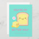 Trae sonrisas con esta encantadora tarjeta de "Eres mi mitad de mantequilla"! Con una rebanada de tostada feliz y un cubo de mantequilla adorable y sonrojado en un fondo de color azul pastel, este diseño combina el humor y el encanto. Perfecto para el Día de San Valentín, aniversarios o simplemente para mostrar aprecio por alguien especial.