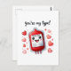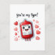 Comparte una sonrisa y un sentimiento dulce con esta encantadora carta que presenta un lindo personaje de una bolsa de sangre rodeado de corazones y el divertido mensaje "¡Eres mi tipo!" Perfecto para enviar una nota única y encantadora a alguien especial. Esta adorable carta es una manera deliciosa de expresar su afecto y aprecio.