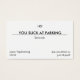 Oye... Eres un asco aparcar en serio. Tamaño de tarjeta de visita. Perfecto para colocarse bajo la hoja del limpiaparabrisas de alguien. Esta versión tiene menos blasfemias y es menos amenazadora que nuestra carta clásica. La próxima vez que veas a alguien estacionado como un agujero-A, ¿no sería bueno tener una de estas tarjetas para hacerles saber cómo te sientes?