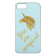 Este funda divertido y elegante está decorado con un unicornio de color dorado y azul ilustrado y el dicho motivacional y bonito: "Eres mágico, lo que lo convierte en un dulce regalo".
