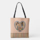 Usted es totes Amados y bolso de cuerpo cruzado todo parte de la serie Blushing in Plaid. Cuatro lujosas laides adornadas con gorras anidados, con pájaros y rodeadas de flores en forma de corazón en rojo y verde con un fondo dorado. Colores: coral, negro, gris y blanco.