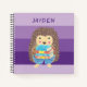 Un divertido cuaderno para niños con un erizo de dibujos animados estudiante que lleva libros sobre un fondo de tonos púrpuras. Personalízalo con el nombre del niño y elige tu tipo de papel. Actualmente está configurado como papel de práctica de escritura a mano.