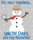 ¡¡Día de la Nieve!! Hay recuerdos especiales de escuchar la radio en un día de tormenta de invierno con la esperanza de escuchar a nuestro sistema escolar en la lista de cierres. Cuando finalmente se anunció, sonó una alegría feliz a través de la casa, pues todos nos fuimos a la cama para disfrutar de unas vacaciones inesperadas. Mis propios hijos tuvieron experiencias similares. Ser un fanático de películas misteriosas fue la inspiración para agregar algo de carácter a este muñeco de nieve junto con un juego de palabras.