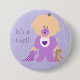 Bebé lindo en morado con un pacificador y oso de peluche rosa que dice: "Es un chica".