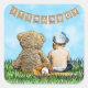 Los pegatinas de la ducha de bebé tienen una temática especial de béisbol para sellar las invitaciones a la ducha de bebé o las bolsas de favores. Un lindo bebé sentado con su oso de peluche, bate de béisbol y guante mirando un campo de béisbol.