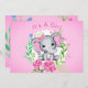 Es una invitación a los elefantes Chicas en Baby Shower rosa y blanco. El pequeño elefante está rodeado de flores rosas y azules y tiene un fondo de polka rosa. La parte posterior sigue el mismo tema. Personalizar con los detalles de la ducha para bebés. Mamá estará encantada con este adorable diseño de elefantes para bebés.