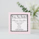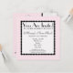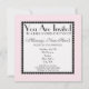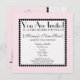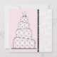 Una invitación para una ducha de bebé con fondo rosa claro con guarnecido de puntos negros en la parte delantera y trasera. Personalice el frente con detalles de su ocasión. En la parte trasera hay un pastel blanco con un patrón de diamante rosa. El pastel es de cuatro capas centrales redondeadas y tiene un carro de bebé encima. El texto a la derecha dice "Es un Chica".