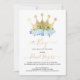 Es un niño, flores y corona dorada, invitación a la fiesta de los bebés: colores azul blanco y dorado.