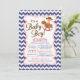Moderna invitación occidental audaz y brillante a la ducha de bebé de vaquero con un lindo vaquero en un mecedor caballo usando pañal rojo y gorras y botas de vaquero marrón. Nuestro programa es una invitación al béisbol para niños se coloca sobre un fondo azul de zigzag chevron y tiene una respuesta para un toque especial extra. Perfecto para una ducha de bebé occidental