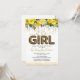 Invitaciones a una ducha de bebé con un fondo blanco simple, purpurina, flores de color amarillo elegante, el dicho "es un chica" en un guion y un globo de impresión de leopardo, y una plantilla de celebración de bebés que es fácil de personalizar.