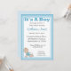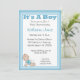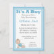 Un bebé lindo con una camisa azul y pañal arrastrándose a través de la invitación a la ducha de bebé. Es un niño que está escrito en la parte superior. Personalizar con los datos de su fiesta.
