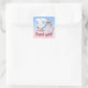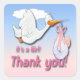 Cuenta con un fondo de degradado azul claro y rosa, una cigüeña con una niña que vuela cerca de una nube. El texto estilizado es ¡Gracias! Pegatina perfecto para una ducha de bebé gracias tarjetas de notas, sellos para sobres de invitación! En nuestra tienda también hay artículos de primera necesidad, como franqueo para ducha de bebé, invitaciones para duchas de bebé, tarjeta de agradecimiento y pegatinas de bienvenida.