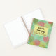 En este libro de boceto hay hojas transparentes de colores sobre un fondo azul claro con un cuadrado amarillo donde puedes personalizar el título de tu libro para hacerlo único tuyo.