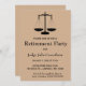 Esta tarjeta de invitación editable presenta las escalas de la justicia sobre un fondo marrón. A continuación se muestran los detalles editables del evento. Esta tarjeta se muestra para la jubilación de un juez, pero también se puede utilizar por cualquier motivo para celebrar (graduación, nuevo trabajo, promoción, jubilación) para cualquier profesión jurídica.