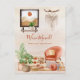 Escena de decoración de hogar bohemio con una silla de brazo de mediados de siglo con almohadones y tus zapatillas favoritas, algunas plantas y una alfombra con una imagen en la pared y un colgante de macramé. Anuncio de mudanza "Nos hemos mudado" boho chic. Diseño compuesto por Holiday Hearts Designs.
