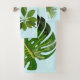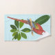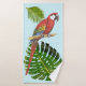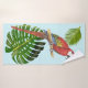 Follaje tropical y macao rojo y azul sobre un fondo azul claro.