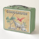 ¡Una metalizado y divertida caja de almuerzo para todos esos niños que aman los dinosaurios! Tiene una escena de dinosaurios diferente a cada lado. El fondo es una tela de lino moreno. ¡Qué lindo!