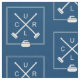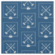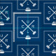Tela que ofrece un modelo de escobas que se encrespan cruzadas en blanco en fondo azul. Perfeccione para los bigudíes y las fans que se encrespan.