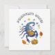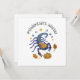 Un ilustracion encantador de Halloween con un cálido y estilizado escorpión azul con una decoración alegre. Debajo descansa una calabaza tallada clásica, lista para la temporada espeluznante. En la parte superior, una estrella aporta un toque festivo, mientras que las hojas de otoño están repartidas por todas partes. El prominente texto de la parte superior declara alegremente: "Es hora de cocinar... algo espeluznante". El diseño general combina elementos tradicionales de Halloween con un toque único y caprichoso.