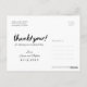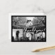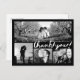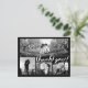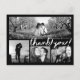 Personalizar de esta elegante foto Gracias postal, diseñada con moderno guión de escritura a mano negrita texto en blanco Gracias! en negro. Reemplace el collage de cuatro imágenes de plantilla con sus 4 fotos favoritas. Una de las imágenes es una gran foto panorámica horizontal y las otras tres son más pequeñas. Para obtener mejores resultados, utilice fotos de alta resolución. También cambie toda la información de la plantilla en ambos lados con la suya propia. Este diseño tiene un texto: "Gracias por compartir en nuestro día especial". Puedes cambiar las palabras con las suyas.