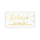 Utilice esta etiqueta de dirección de vacaciones Gold Believe para enviar las tarjetas de vacaciones correspondientes en nuestra tienda. Elke Clarke © Efecto de Relieve metalizado de oro impreso en una superficie MATTE (no brillante). letra de escritura a mano de bonito para la palabra "creer". Patrón de confeti estelar. Dirección de devolución de personalizable.