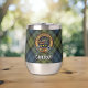 Insignia de Campbell escudo rodeada de una correa y hebilla sobre fondo tartán. Texto personalizado en ambos lados.