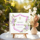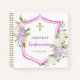 Un fondo blanco. Decorada con un escudo rosa, flores rosadas y violetas, flores. Con una cruz dorada. Personalice y agregue un nombre y una fecha. Se puede usar como libro de invitados o para planificar el evento.