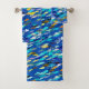 Toalla colocada en una escuela de pescado en un océano azul profundo, en tonos azules, turquesa, dorado y blanco