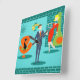 ¡Cariño, estoy en casa! Este Retro Space Age Personalizado Pared Pared CLock te hará sentir envidioso de la pareja personalizado en un reloj de pared! El diseño presenta un fondo turquesa con ladrillos verde azulados y una chimenea de conos de color verde oliva. Un gato negro y elegante está sentado en una elegante silla naranja. Un verde azulado reloj de pared con estribo y una lámpara colgante de dos niveles en tonos amarillos, azules y negros. En el centro, un distinguido empresario martini, vestido con traje azul y corbata naranja. A su lado, la bomba rubia de una mujer trofeo lleva un vestido de maleza roja y una bandeja de martinis. ¡Va-va-va-voom!