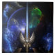En Esta Versión De "La Espada Del Ala Ángel De Arclédico" Creé Un Fondo Espacial Y Una Tierra Mirando Hacia Delante Que Fue Mi Intención Original Cuando Comencé A Hacer Esta Obra. Esta Creación, Sin Embargo, Con Este Tipo De Antecedentes, Hace Que Se Desplace La Atención De La Espada, Ya Que Hay Muchos Otros Elementos Complejos Para Atraer La Atención De Los Espectadores. Para Hacer Posible Esta Versión Añadí 11 Elementos Fractales Adicionales A Los 23 Originales Para Un Total De 34 Elementos Fractales. También Modificé La Espada De Ángel Que Le Da Un ligero Resplandor Para Que Parezca Ser Resaltado Por El Clúster Central De Nebulas Que Emite Luz Blanca. La Espada Del Ala Ángel De La Azulejos Espaciales Arquediosa