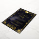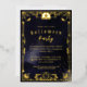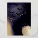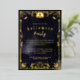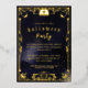 Fantástica invitación al Relieve metalizado de la fiesta de Halloween. El diseño presenta nuestra propia tarjeta de tarot holística de Halloween dibujada a mano en Relieve metalizado dorado. El diseño se ha creado con detalles intrincados y decorativos de Halloween. El fondo está decorado con un audaz diseño azul marino y dorado con dos estrellas de imitación de oro. Personalizar con su monograma, detalles del evento y hora. El reverso presenta un fondo atrevido de tinta azul marino con falsos acentos dorados y elementos murciélagos. Diseñado por Moodthology Papery.
