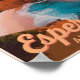 Diseño de viaje vectorial retro esperanzador. Sus playas incluyen el tranquilo Blue Haven y West Beach, con sus olas para practicar surf.