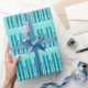 Esquíes azules sobre la nieve con Navidades de fondo azul envolviendo papel.