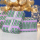 Esquíes verdes sobre la nieve con Navidades de fondo morado envolviendo papel.
