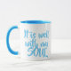 Esta taza de café está en azul claro y tiene las palabras que está bien con mi alma en ambas caras.