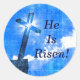 Diseño fotográfico original de una cruz de iglesia con un efecto estelar sobre cielos azules con el texto "¡Está en pie!". Esta versión está todo en tonos azules con nubes blancas. Cambiar fácilmente el texto para personalizar. Un pegatina inspirador para Pascua y en cualquier momento del año.