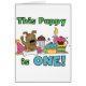 Diseño de cachorros camisetas de primer cumpleaños, trajes para el cuerpo, imanes, tarjetas, bolsos de té, botones de primer cumpleaños y más con una vela de cumpleaños, un adorable cachorro marrón, un gorra fiesta y muchos dulces de cumpleaños.
