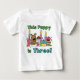 Diseño de cachorros camisetas de 3 años, bodysuit, imanes, tarjetas, bolsos de tote, botones de 3 años, y más con velas de cumpleaños, un adorable cachorro marrón, un gorra fiesta, ¡y muchos dulces de cumpleaños! El texto dice "¡Este cachorro es 3!".
