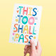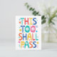 Alentar a alguien a colgar ahí con este diseño decorativo y colorido de tipografía que muestra el mensaje, "Esto también pasará". El tipo se acentúa con brillantes y alegres iconos florales, estelares y mariposas. El interior se puede personalizar para adaptarlo a sus necesidades.