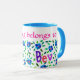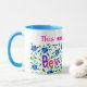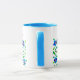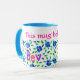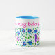 Una taza de ringer blanca con una llanta y mango azul en polvo, decorada con un collage de papel pintado a mano con flores y las palabras 'Esta taza pertenece a Bev'. Apta para microondas y lavavajillas.