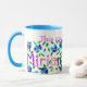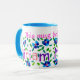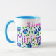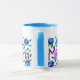 Una taza de ringer blanca con una llanta y mango azul en polvo, decorada con un collage de papel pintado a mano con flores y las palabras "Esta taza pertenece a Miriam". Apta para microondas y lavavajillas.