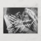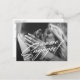 Anuncio de compromiso moderno y elegante en blanco y negro. El diseño presenta una sola foto, tipografía script 'estamos comprometidos' en la parte delantera y su mensaje en la parte trasera. Perfecto para anunciar su gran noticia.