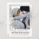 Comparte tu compromiso con tus amigos y familiares con este anuncio de compromiso. La plantilla de bricolaje es fácil de usar. Puede subir fácilmente una foto de los dos, cambiar los nombres y agregar un mensaje personalizado. A la gente le encantará ver a los dos juntos. El dibujo de línea de arte de Navidad abierto enmarca el lado izquierdo de tu foto. Los contornos de la poinsettia negra y el acebo están salpicados con confeti dorado brillante. Un suave lavado de acuarela gris neutral proporciona un marco para el resto de la foto. Elegante y sofisticado.