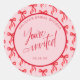 "Estás invitado" sellos para sobres de ducha de novia personalizados con el arco rojo rosado. Un patrón de arco rojo completo y un guión escrito a mano elegante. Simplemente personaliza la plantilla con el título del evento y la fecha. Es posible que necesite utilizar la Herramienta de edición para ajustar la curva del texto. © Kimbellished, LLC
