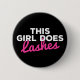 Este chica hace características del botón de los latigazos un fondo negro y un diseño blanco y rosado intrépido.