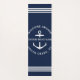 Estera náutica de yoga en azul marino que dice "bienvenido a bordo", así como el nombre y ubicación de tu barco personalizado.