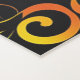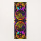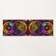 Balanced and harmonious, this design for a yoga mat features neon colors on a black background, with two circles. The larger circles has a feathery pattern, and the smaller circle has little circles and half circles. Beautiful, colorful, very Zen-like.