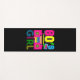 Una alfombra negra de yoga con un diseño que dice Chica de los años 80 en colores vivos de neón, colocada en un suelo de madera clara al lado de una botella de agua blanca. El "80" está estilizado con el "8" en rosa, el "0" en amarillo y el "S" en azul, con un gráfico de cinta de cassette incorporado. Debajo, la palabra "Chica" está escrita en verde, azul y amarillo, con cada letra en un color diferente. Una caja rosa con detalles amarillos y azules se sitúa entre los "80" y el "Chica".